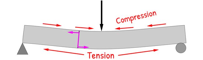 When a beam is loaded, it bends slightly. This compresses the beam at the top while stretches at the bottom. So, the fibres at the bottom of the beam are in tension, while the fibres at the top are in compression.