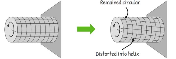 Imagine a grid of circular lines and straight lines along the length of the shaft. Now, when we apply torque at the free end, we see that different cross-sections of the shaft rotate by slightly different amounts along its length. We notice, circular cross-sections remain circular but the straight longitudinal lines distort into a helical shape.