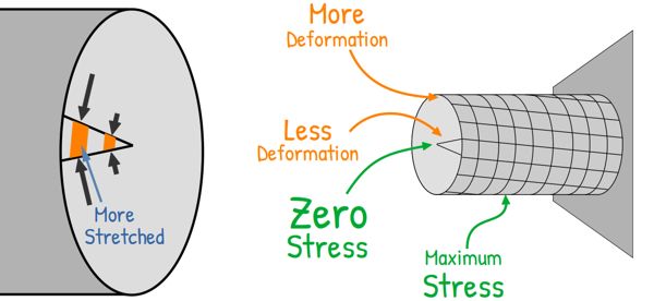 At the very center of the shaft, the stress is actually Zero. As we move outward toward the surface, the stress grows until it reaches its maximum at the edge.