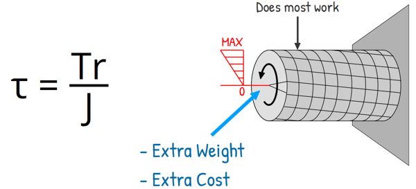 This means the material near the center is barely contributing to resisting the torque. Most of the work is actually being done by the material near the outer surface.