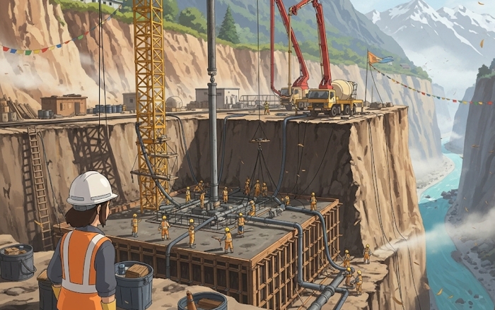 To achieve this, engineers excavated large pits into the strengthened sides of the gorge. Dense cages of steel rebar were meticulously assembled inside, forming a rigid skeletal framework. Then, using high-pressure pumps and pipelines, high-strength concrete was poured layer by layer into these forms — creating the stable foundations the ARCH and other piers would eventually rest upon.