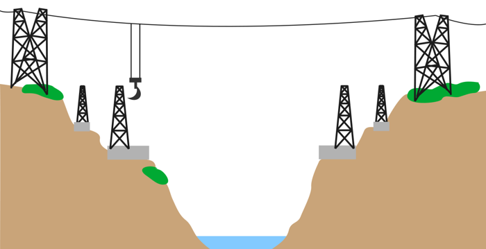 To solve this, they installed a temporary aerial cable crane system across the gorge — spanning nearly 915 metres. This cable crane became the site’s logistical lifeline, delivering everything from rock anchors and grout to rebar, scaffolding, and formwork.