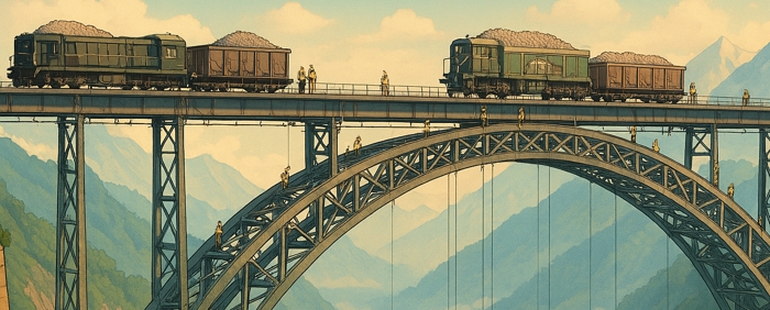 Then came dynamic load tests, using actual locomotives moving at different speeds to observe how the bridge responded to motion, vibration, and sudden load changes.
