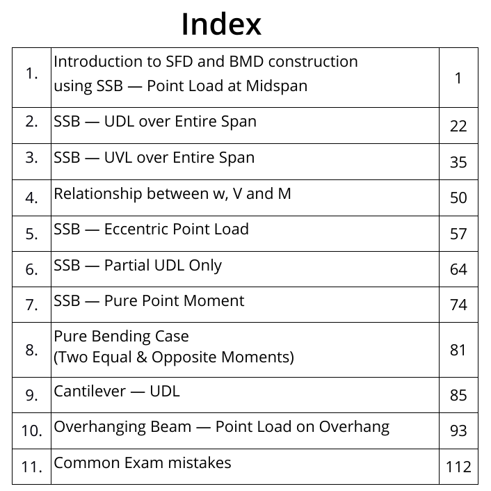 Instead of covering every possible beam and loading, this book focuses on the core SFD–BMD cases that appear repeatedly in exams and that students most often make mistakes in.